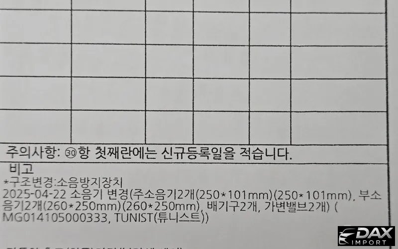 비금속 또는 탈부착 가능한 부품은 점검사항에서 제외되며 중고차 특성상 부분적인 판금도색은 있을 수 있습니다. 구조변경: 소음방지장치 소음기 변경(주소음기 2개, 부소음기 2개, 배기구 2개, 가변밸브 2개) - 등록증 확인